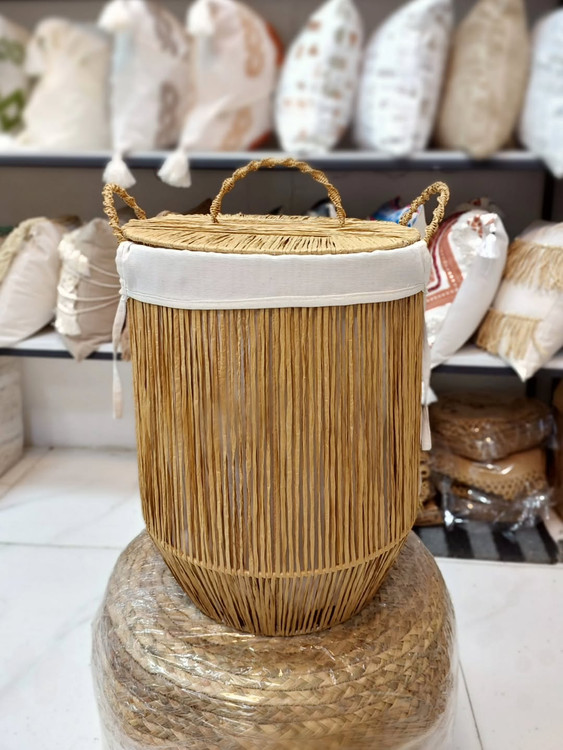 سه مدل سبد رافیای کاربردی رافیا توی دیزاین یعنی گرمای طبیعی؛ کنار چوب روشن، کرم و بژ، طوسی، سبز زیتونی، حتی فضاهای سفید و مینیمال… یه بافت خنثیِ گرم که راحت خودش رو هماهنگ میکنه. لاندریباکس دردار رافیا برای جمع کردن لباسها یا هر بینظمیِ دور از دید. استوانه نظمدهنده رافیا جمعوجور و کاربردی برای میز، شلف یا سرویس. سبد کوسن رافیا یه گوشهی گرم و دکوراتیو کنار مبل یا آینه و کنسول.